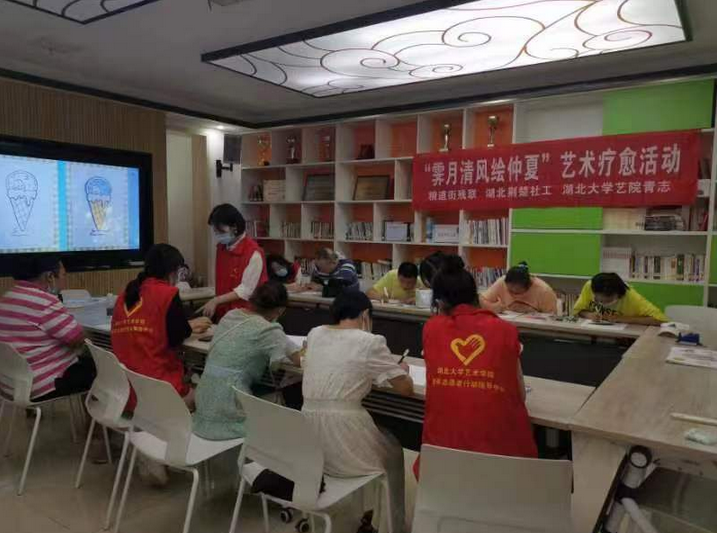 当天活动的主题是“霁月清风绘仲夏”。志愿者们首先通过“色彩情感”小活动进行暖场。接着,志愿者们带领“阳光学员”将他们对夏日的感受用色彩表达出来,而不强调绘画技术,这种通过艺术的创造性过程有利于改善参与者的生理、心理状态。在学员们的笔下,冰淇淋小兔子、清爽西瓜等跃然纸上。随后,志愿者们将学员们今年上半年创作的画作进行展示。面对自己创作的一幅幅作品,有些学员还有些害羞,多数学员还是主动地表达感情。由于武汉夏季炎热,志愿者们还细致耐心地给学员们介绍了一些防暑降温的知识。活动最后,湖大威廉希尔williamhill团委书记许诩给学员们送上了自己创作的书法作品,祝福每一位学员暑期健康快乐。