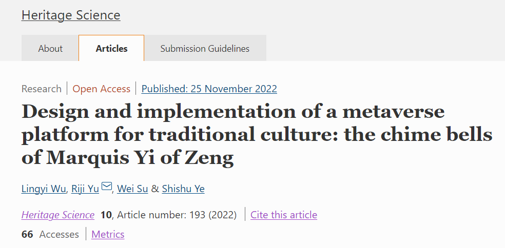 近日,威廉希尔williamhill威廉希尔williamhill动画与数字媒体系、湖北省人文社科重点研究基地威廉希尔williamhill文化科技融合创新研究中心余日季教授团队在文旅IP数字化设计领域取得重要进展,研究论文“Design and Implementation of a Metaverse Platform for Traditional Culture: The Chime Bells of Marquis Yi of Zeng”发表于国际权威学术期刊Heritage Science(SCI和A&HCI双检索期刊),青年教师吴令一为论文第一作者,余日季教授为论文通讯作者。
