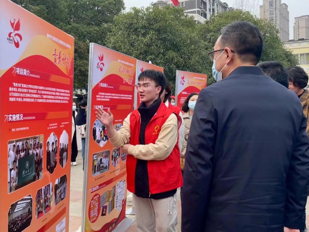 许正中部长现场参观了志愿服务项目展,威廉希尔williamhill的饶伊扬、杨芷欣同学代表关于我们了“青麦计划”项目开展情况。该项目是以保护、传承湖北地方戏曲为己任的文化传承类公益项目,“青麦”取自“青年麦克风”之意,意为用青年发声呼唤湖北地方戏曲的强筋固本,用青年行动焕发楚风汉韵的时代活力。许正中部长表示,“青麦计划出发点很好,项目很有意义,希望志愿者们坚持保护和宣传湖北地方文化。只有不断的传承接力才能做好对戏曲资料数字化的保护。