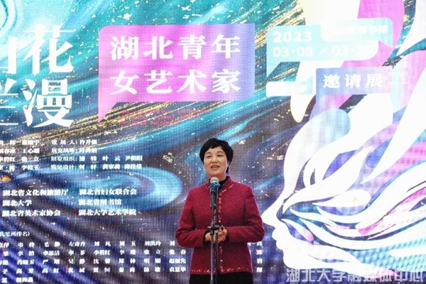 管成文、尚辉、刘春冰在致辞中预祝展览圆满成功。邓长青代表湖北省妇女联合会向参展的女艺术家致以节日问候,并宣布“山花烂漫——湖北青年女艺术家作品邀请展”开幕。