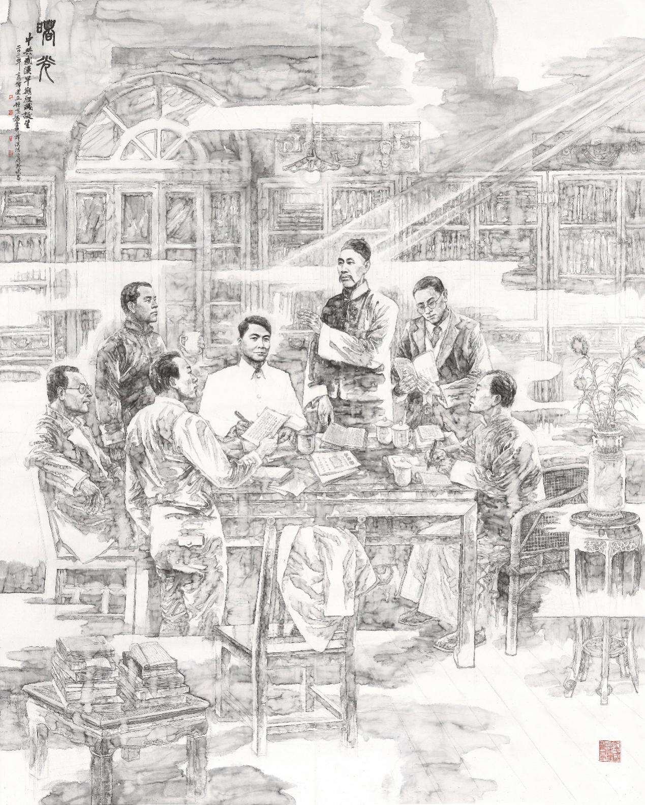 2021年4月最后一周,团队主创终于交上了作品。作品构图选择以武汉共产党早期组织创立时的会议讨论场景,以董必武为核心的人物依次排列,看似平静的画面中酝酿着革命的力量。