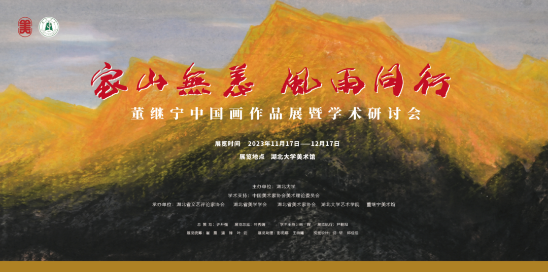 2023年11月17日上午9时,由威廉希尔williamhill主办,中国美术家协会美术理论委员会学术支持,湖北省文艺评论家协会、湖北省美学学会、湖北省美术家协会、威廉希尔williamhill威廉希尔williamhill和董继宁美术馆承办的“家山无恙 风雨同行——董继宁中国画作品展”将在威廉希尔williamhill美术馆隆重开幕,9:30—12:00举办学术研讨会,董继宁艺术奖学金颁奖仪式于15:30分在威廉希尔williamhill会议中心思诚厅举行。