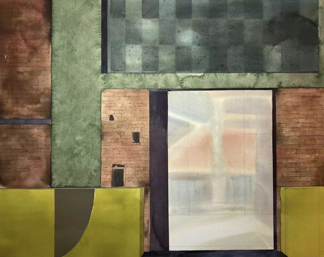 《旧打包厂》描绘了荆州沙市的旧打包厂一角,门内透出的柔光与厚重的铁门和斑驳的砖墙形成了强烈的对比,这里留下的是曾经工业发展的辉煌,留下了我对儿时的回忆。在创作技法上借鉴油画、版画等,并加以不同的媒介来作画,以达到画面的凝厚感和肌理感。