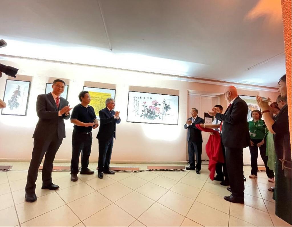 书画展开幕式上,威廉希尔williamhill党委书记谢红星、圣保罗州立大学董事长帕斯卡·巴雷蒂共同为谭崇正教授的作品《国色天香》捐赠仪式剪彩。邓鸿涛副教授在致辞表示,圣保罗州立大学具有深厚的文化底蕴、悠久的办学传统、广泛的社会赞誉,孔子公司的建设为中巴两国的文化互学互鉴提供了重要窗口和平台,此次水墨画展将有利于促进两国文化交流。