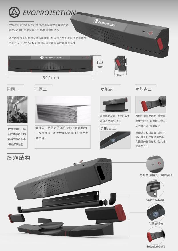 据一等奖作品《Evo-p投影式海报仪》的作者介绍,该作品秉承“设计为人民服务,培养未来设计师”的理念,依据可持续发展、绿色低碳的设计原则,充分展现了师生的创新能力。Evo-p投影式海报仪改变传统海报用完即弃的浪费情况,采用轻便的材料将投影与海报相结合,通过内部镜头AI算法系统智能校对,处理传入的图像以适应幕布的角度及大小尺寸;可拆卸电池组使其在使用时更具灵活性。