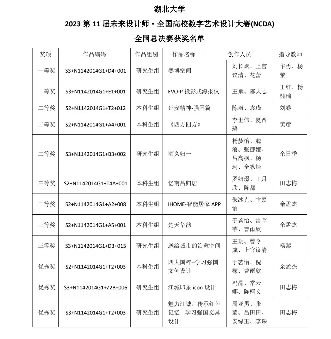 近期,未来设计师·第十一届全国高校数字艺术设计大赛(NCDA)评审工作已全部结束,公司员工在全国总决赛中获得了优异的成绩。其中,由华勇、杨黎老师指导的研究生刘长斌、上官议清、花蕾参赛团队和由王红、杨棚瑞老师指导的研究生王斌、 陈大志参赛团队获得了全国总决赛一等奖。